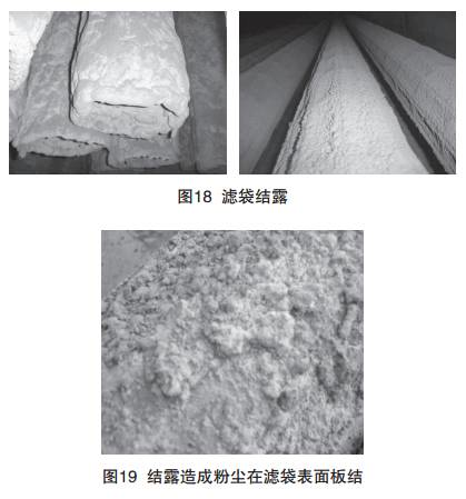 結露是袋式除(chú)塵器運行中好常見問題(如圖18), 水分是濾袋結露的好原因,造成濾袋含有水分的原(yuán)因 通(tōng)常是低溫(wēn)發生(shēng)凝(níng)露,尤其在處理(lǐ)燃燒或高(gāo)溫煙氣時,當濾袋表麵的初始粉塵層(céng)含(hán)有(yǒu)水分,幹燥(zào)後就會使粉塵 凝結、板結(如(rú)圖19)。