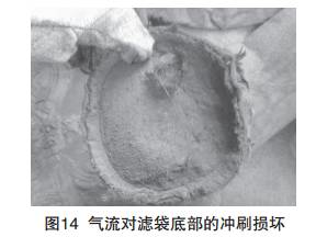 由於噴吹管內的氣(qì)流為橫向運行,當導流管(guǎn)設置不 當時,產生的噴吹管氣流就不(bú)是垂(chuí)直而是傾斜向下(xià)噴入 濾袋,就會造成袋口部位下方約(yuē)300mm處產生由內向外 的破損(如(rú)圖12、13所示)。