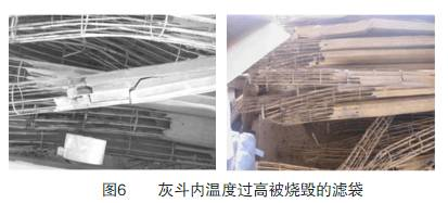 高溫(wēn)粉塵被收入灰鬥後(hòu),如果不能及時排出,粉塵會長(zhǎng)期蓄積在灰鬥裏造成灰鬥內溫度不斷升高,濾袋(dài)長期在高溫烘烤下就會變脆、變硬,嚴重(chóng)時則會燒毀,尤其是粉塵中含有的易燃物質,會在灰鬥內燃(rán)燒,從(cóng)而燒毀濾袋(如圖6)。