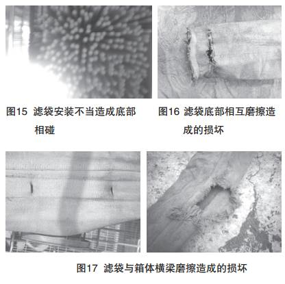 濾袋安裝不良(liáng),會由於花板、骨架等原因不與花板 相垂直(zhí)(如圖15);如果過於偏斜就會造成濾袋底部相 互磨擦而損壞(如圖16);濾袋與(yǔ)壁板及(jí)濾袋與箱體橫 梁間也會由於磨擦而造成濾(lǜ)袋損壞(如圖17)。