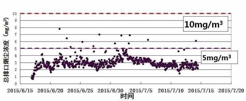 參照《固(gù)定汙染源煙氣排放連續監測技術規範(試行)》(HJ/T 75-2007),將現場測試數據與除塵器出口、煙囪出口的CEMS數據進(jìn)行比對,在滿足比對(duì)標準(zhǔn)的基礎上,提取2015年6月30日~7月15的CEMS在線數據進行達標性與穩定性分析(xī)[6]。在(zài)此期間,1號機組入爐煤灰分在37%~45%波動(dòng),從圖1、圖2可以看出(chū),除塵(chén)器出口煙塵(chén)排放濃度為1.92~9.39mg/m3,平均濃度為4.82mg/m3,低於設計值10mg/m3達標保證率為100%,裝備的穩定性較好。煙(yān)囪出口煙塵排放濃(nóng)度為0.71~7.82mg/m3,平均濃度為3.10mg/m3,低於10mg/m3達標保證(zhèng)率為100%,滿足超低排放要求。