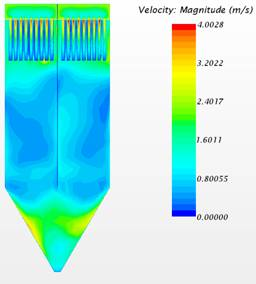 另,通過(guò)對(duì)除塵器內部流場CFD分析對比得知,將濾袋替換為濾筒後(hòu),內部流場大為改善,大幅(fú)減少濾芯底部(bù)的衝刷,提(tí)高了使(shǐ)用壽(shòu)命。在濾筒的下方區域形成較大的灰(huī)塵沉降(jiàng)區,利於(yú)大顆粒的預沉降,除塵效果更加優異。