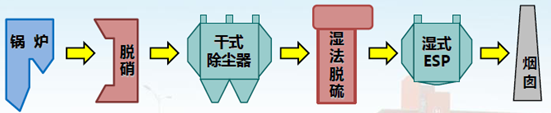 如圖1所示,濕式靜電除塵器一般布置在濕法脫硫之後。濕(shī)法脫硫出口煙氣(qì)中的大部分粉塵已(yǐ)被幹式電除塵除去,並成為夾帶石膏顆粒的濕(shī)飽和煙氣,通過濕式靜電除塵器處(chù)理後,達到排放要求,由煙囪排出。