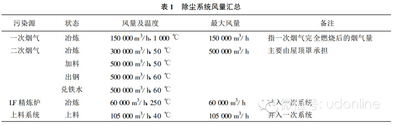 5)   除塵係統風量匯總:除塵係統風(fēng)量匯總見表1。